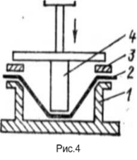 Формование толкателем применяется для изготовления изделий простой конфигурации в виде усеченного конуса, пирамиды и их разновидностей. Форма изделия определяется конструкцией зажимной рамы и толкателя. Так, если использовать круглую раму и квадратный толкатель, то основание изделия будет в виде квадрата, а верх конический. Изделия изготовляются в такой последовательности. Разогретый лист 2 укладывают на поддон 1, прижимают рамой 3, а затем с помощью толкателя 4 проводят формование изделия (рис.4) Основным недостатком данного метода является медленное охлаждение изделия, так как оно не всей поверхностью соприкасается с пуансоном и поддоном. Этот метод непроизводителен, поэтому применяется сравнительно редко.
