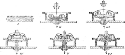 При изготовлении изделий сложной конструкции, в особенности с двояковыпуклым днищем, применяют комбинированное формование (рис. 11). Лист закрепляют в раме и нагревают (/), затем подводят к форме, в которой создается давление (//). Происходит предварительная вытяжка воздухом, и пуансон вводится в полусферу заготовки (///). Затем сверху опускается толкатель, с помощью которого проводится предварительное формование внутренних элементов изделия (IV—V). Окончательное формование осуществляется под действием вакуума, который создается между листом и пуансоном (VI). Данный способ обеспечивает равномерную вытяжку листа и хорошую равнотолщинность стенок изделия.