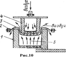Вакуумформование с вытяжкой воздушной подушкой. В тех случаях, когда требуется изготовить глубокое изделие и обеспечить разнотолщинность стенок, применяют формование с предварительной вытяжкой листа воздушной подушкой (рис.10). Лист закрепляют между двумя рамами 2, размер которых больше матрицы, и проводят нагревание. В толкатель 4 подают подогретый воздух и начинают опускать его на лист.