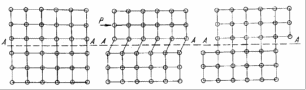 В основе пластического деформирования металлов лежит перемещение дислокаций практически при любых температурах и скоростях деформирования. Сущностью пластического деформирования является сдвиг в результате которого одна часть кристалла смещается по отношению к другой части. Для сдвига в идеальном кристалле, в котором все атомы на плоскости сдвига сразу перемещаются на одно межатомное расстояние, нужно, как показывают расчеты, касательное напряжение 0,1 G (G - модуль упругости сдвига). В реальных кристаллах сдвиг происходит при напряжениях всего 10 - 4 G, что в 1000 раз меньше теоретически необходимых. Это объясняется тем, что происходит за счет скольжения дислокаций и в нем участвует незначительная доля атомов, расположенных на плоскости сдвига (рис.1).