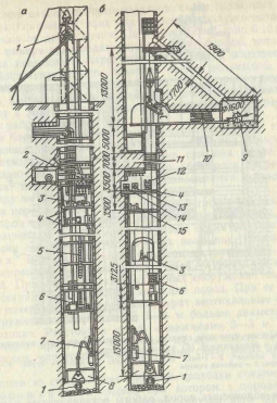 Подготовка новых горизонтов на шахтах вызывает необходимость в углубке действующих вертикальных стволов, которая может быть выполнена сверху вниз и снизу вверх. Углубку сверху вниз в мягких породах производят с устройством в стволе под зумпфом предохранительного полка, в крепких породах—с оставлением предохранительного целика высотой до 8 м (рис.).