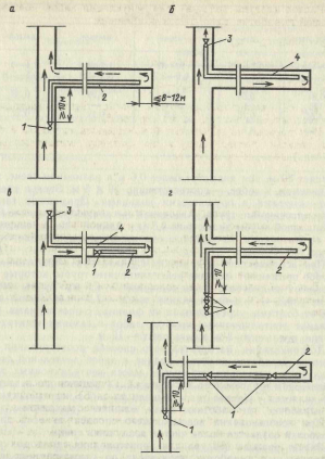 Нагнетательный (а,г,д), всасывающий (б), способы вентиляции тупиковых выработок при использовании одного (а,б) и нескольких (в,г,д) вентиляторов местного проветривания: