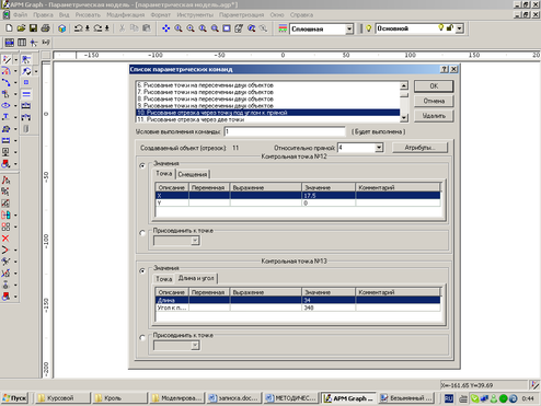 Для построения модели графически задается последовательность графических команд. При этом в расчетных выражениях указываются параметры для команд (рис.7.). В представленном окне команд зафиксирована графическая команда Рисование отрезка под углом к прямой. С помощью этой команды изображается главная задняя поверхность резца. В группе Значение выбирается вкладка Длина и угол.