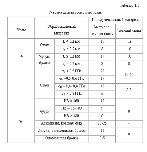 Выбираем величину переднего γ0 и заднего α0 углов резца в зависимости от обрабатываемого материала.