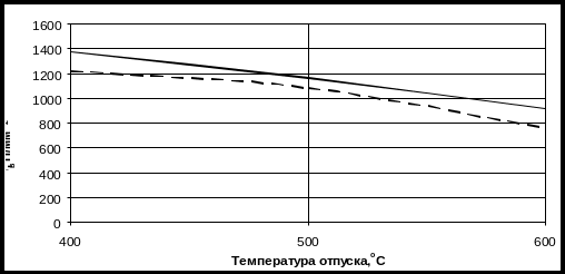 Рисунок 2.1 – Графики зависимости σ0,2 (– –)и σв (–) от температуры отпуска