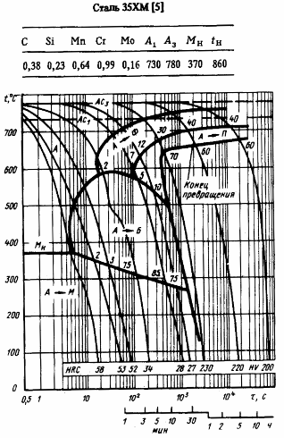 Рисунок 2.4 – Термокинетическая диаграмма распада переохлаждённого аустенита для стали 35ХМ [1]