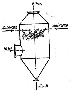 В полых газопромывателях запыленные газы пропускают через завесу запыленной жидкости. При этом частицы пыли захватываются каплями жидкости и осаждаются, очищенные газы удаляются.