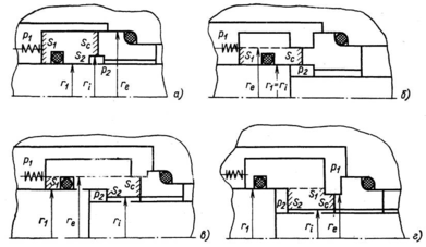 Знаки площ S1 та S2 вважатимемо додатними, якщо сили тиску, що на них виникають, збільшують контактний тиск у парі тертя (рис. 7), та від’ємними, якщо відповідні сили тиску розкривають торцевий стик. З урахуванням прийнятого правила знаків Sc = S1 + S2, а вираз для сили F можна записати у вигляді