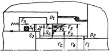 де Fn – сила пружного елемента; Fs - сила, що обумовлена гідростатичним тиском ps у торцевому зазорі; Fc=pcSc - сила контактного тиску; Fm – сила тертя по вторинному ущільненню, яка перешкоджає зміщенню аксіально рухомого кільця в той або інший бік; F – осьова сила тиску, яка притискає аксіально рухоме кільце до опорної поверхні