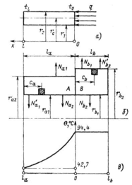 У реальних ущільненнях кільця на різних ділянках поверхні стикаються з різним середовищем або виконані складовими з матеріалів з різними коефіцієнтами теплопровідності, тому розрахункова схема може бути представлена (рис. 11 б) циліндрами з різними коефіцієнтами тепловіддачі та температурами середовища на окремих ділянках поверхні. При цьому повна тепловіддача кожного кільця складається з суми тепловіддач окремих ділянок: