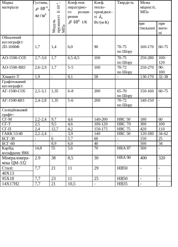 Фізичні характеристики: матеріал кілець - обпалений графіт 2П-1000-Ф, просочений фенолформальдегідною смолою;