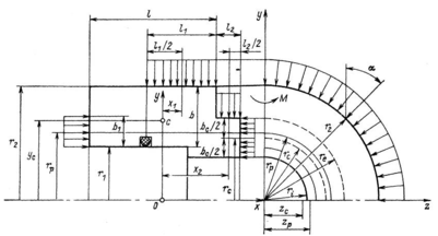 де (рис. 12) ус - радіус центра ваги перерізу; Іу - момент інерції перерізу відносно осі Оу, що проходить через центр ваги та перпендикулярної до осі кільця; Е - модуль пружності матеріалу кільця; Mt, Мр - моменти сил відносно осі Оу, обумовлених нерівномірністю полів температур та тиску.