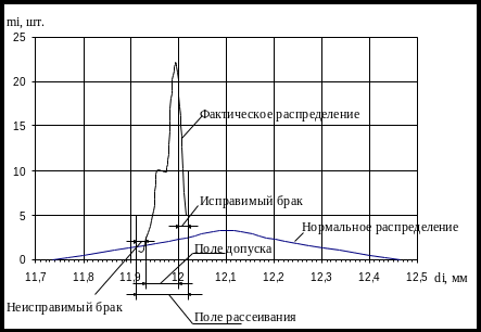 Необходимо сопоставить проведенные исследования графически и определить, насколько полученная кривая распределения фактических размеров приближается к теоретической кривой нормального распределения. Рассчитать данные, необходимые для построения кривой нормального распределения.