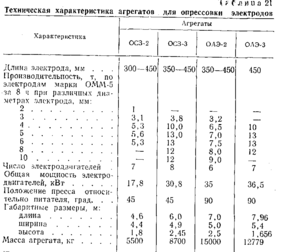 На рис. показан агрегат для опрессовки электродов, в табл. дана техническая характеристика агрегатов различных марок.