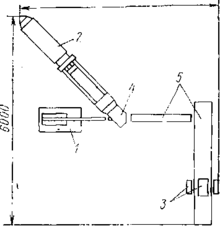 Рис. Схема агрегата типа ОСЗ-3 для опрессовки электродов: 1 — питатель стержней; 2—пресс гидравлической; 3 — зачистная машина; 4—головка пресса; В—транспортеры