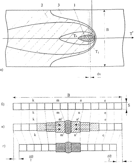 Рисунок 5.1 Схема образований поперечных деформаций а - расчленение полосы на области; в - поперечное сечение полосы до прохождения дуги; г - поперечное сечение полосы вскоре после прохождения дуги: д - поперечное сечение после остывания полосы