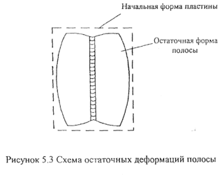 Когда полоска оказывается в положении, показанном на рис 5.1 а, происходят деформации по длине и толщине полоски. Очевидно, что увеличение длины полоски исключено, так как её концевые участки принадлежат области 2 и жестко связаны между собой. Вместе с тем центральный участок полоски, принадлежащий области 1, находится в пластическом состоянии и практически не оказывает сопротивления сжимающему усилию. Поэтому стремление нагретой полоски удлиниться реализуется путём перемещения нагретых участков её к середине. При этом концевые полоски (слева от сечения к-к и справа от сечения 1-1 на рисунке 5.1) не смещаются. Средние участки нагретой зоны (участки к-к. m-m и п-п...1-1) увеличивают свою ширину и перемещаются к центру оси. Обжатие центрального участка поперечной полоски происходит с образованием дополнительных пластических деформаций укорочения. При остывании постепенно восстанавливается исходная ширина средних участков, вследствие чего они стремятся переместиться к центру. При достаточной продольной жёсткости полосы эти перемещения удерживаются подковообразным контуром, в результате чего в средних участках могут происходить пластические деформации удлинения, которые лишь частично компенсируют пластические деформации укорочения. Из рис.5.1 г видно, что поперечные пластические деформации укорочения локализуются вблизи шва. Ширина полосы после остывания уменьшается на величину ЛВ.