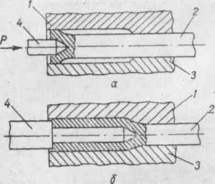 Рис. 11. 17. Висаджування потовщень у ковзних матрицях на початковій (а) та кінцевій (б) стадіях: