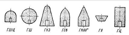 Шлифовальные головки. По ГОСТ 2447 – 64 шлифовальные головки выпускаются семи форм (рис. 5). Они применяются для внутреннего шлифования и для зачистки заготовок, когда не могут быть применены шлифовальные круги. Головки не имеют сквозных посадочных отверстий и приклеиваются к специальным шпилькам; диаметр головки 3 – 40 мм.