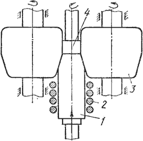 Поперечной прокаткой накатывают зубья шестерен между двумя вращающимися валками. Возможны два способа обработки зубьев: с осевой подачей обрабатываемой заготовки (прутковая прокатка) и прокатка с радиальной подачей валков (штучная прокатка). Прутковая прокатка шестерен (рис. 5) применяется для обработки прямозубых и косозубых шестерен с небольшими модулями (до 6 мм) и диаметром до 200 мм. Образование зубьев при прокатке осуществляется перемещением нагретой в кольцевом индукторе 2 заготовки 1 между двумя вращающимися зубчатыми валками 3, модуль которых равен модулю прокатываемой шестерни 4. В начале прокатки заготовка приводится во вращение дополнительным зубчатым колесом, находящимся в зацеплении с валками. После выхода из зацепления шестерня вращается валками.