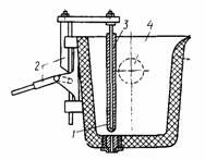 Выплавленную в плавильной печи сталь выпускают в сталеразливочный ковш (рис.1) и мостовым краном переносят к месту разливки в слитки. Емкость ковша обычно определяется емкостью плавильной печи и составляет 5...250 т. Для крупных плавильных печей применяют ковши емкостью до 450 т (диаметром и высотой до 6 м). Сталь разливают в изложницы или кристаллизаторы установок для непрерывной разливки. Изложницы представляют собой чугунные формы для получения слитков различного сечения. Масса слитков для прокатки обычно составляет 10...12 т (реже — до 25 т), а для поковок достигает 250... 300 т. Легированные стали иногда разливают в слитки массой в несколько сотен килограммов. Применяют два способа разливки стали в изложницы: сверху и сифоном. При разливки сверху (рис. 2 А) сталь заливают из ковша 2 в каждую изложницу 1 отдельно. При такой разливке поверхность слитков вследствие попадания брызг жидкого металла на стенки изложницы может быть загрязненной пленками оксидов.