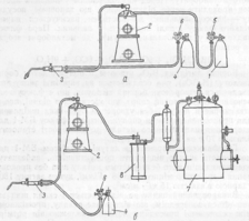 Рис. 2. Схема установки для зварювання з газоподібним флюсом при живленні ацетиленом від балона (а) та від ацетиленового генератора (б) ;