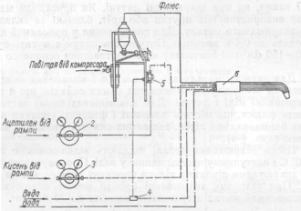 1 — балон з ацетиленом; 2 — флюсоживильник; 3 — пальник: 4 — балон з киснем; 5 — ацетиленовий редуктор; 6 — кисневий редуктор; 7 — ацетиленовий генератор; 8 — осушник.