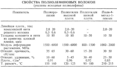Основные свойства полиолефиновых волокон приведены в таблице. Прочность фибрил-лиррованных нитей с повышением степени фибрилляции снижается. Волокна и нити обладают высокими диэлектрическими свойствами (е 2,1-2,5 при частоте 1·106 Гц). Трудно воспламеняются, но горят. Гидрофобны, устойчивы в кислота и щелочах. Не растворяются в неполярных органических растворителях (бензол, толуол, декалин, тетралин) ввиду высокой кристалличности полиолефинов при комнатной температуре, но с повышением температуры набухают, а затем растворяются. Устойчивы к действию микроорганизмов.