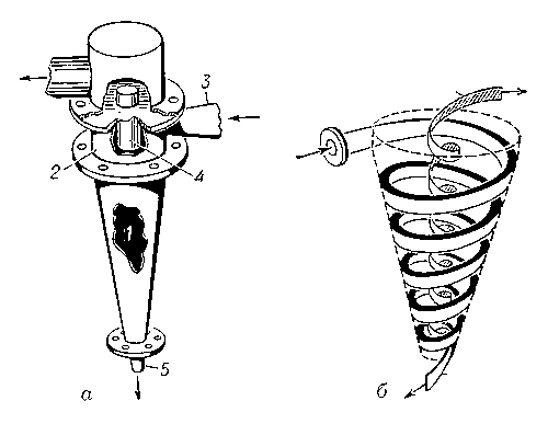 Гидроциклон: а — общий вид; б — схема потоков
