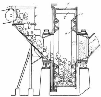 Мельница «Аэрофол» для сухого самоизмельчения (рис. 2) представляет собой короткий барабан 1 большого диаметра (5,5 - 11 м). На внутренней поверхности вдоль образующей барабана на некотором расстоянии друг от друга укрепляются балки-ребра 2, которые при вращении барабана поднимают куски материала. Падая вниз, куски разбиваются, ударяясь о ребра, одновременно они дробят ударом находящийся внизу материал. На торцовых крышках 3 барабана укреплены кольца 4 треугольного сечения. Назначение этих колец — направлять куски материала в середину барабана.