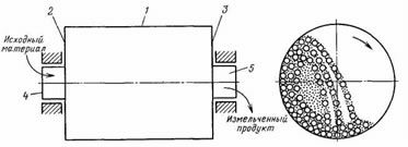 Барабанная мельница (рис. 1) представляет собой пустотелый барабан 1, закрытый торцовыми крышками 2 и 3, в центре которых имеются полые цапфы 4 и 5. Цапфы опираются на подшипники, и барабан вращается вокруг горизонтальной оси. Барабан мельницы заполняется примерно на половину объема дробящей средой (дробящими телами). При его вращении дробящие тела благодаря трению увлекаются его внутренней поверхностью, поднимаются на некоторую высоту и свободно или перекатываясь падают вниз. Через одну полую цапфу внутрь барабана непрерывно подается измельчаемый материал, который проходит вдоль него и, подвергаясь воздействию дробящих тел, измельчается ударом, истиранием и раздавливанием. Измельченный продукт непрерывно разгружается через другую полую цапфу. При вращении барабана материал движется вдоль его оси вследствие перепада уровней загрузки и разгрузки и напора непрерывной подачи материала; если измельчение мокрое, то материал увлекается сливным потоком воды, а если сухое — воздушным потоком, возникающим при отсасывании воздуха из барабана.