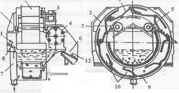 В сепораторах типа СКВ (рис. 2) с вертикальным элеваторным колесом (производительностью 160—380 т/ч) исходный материал 11 в ванну сепаратора поступает по желобу 8, а тяжелая суспензия — через нижний патрубок и распределительное устройство 7. Легкая фракция 12 разгружается гребковым механизмом 4 в желоб 6. Тяжелая фракция 13оседает в ковшах 10 элеваторного колеса 2 и удаляется из сепаратора при его вращении (2—3 мин-1) приводом 3. Внутренней частью своего кольца колесо 2 опирается на опорные катки 5, закрепленные на корпусе 1. Решетки 9, шарнирно соединенные с ковшами, позволяют зернам тяжелой фракции загружаться в эти ковши с внутренней стороны элеваторного колеса, а выгружаться — с наружной.