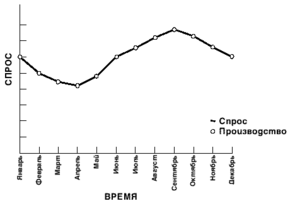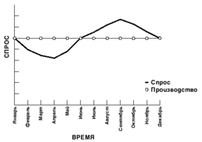 При равномерном производстве постоянно производится объем продукции, равный среднему спросу. Это соотношение отображено на рис.9. Предприятия рассчитывают общий спрос на охватываемый планом период времени и в среднем производят достаточный объем для удовлетворения этого спроса. Иногда спрос оказывается меньше произведенного объема, в этом случае накапливаются материально-производственные запасы. В другие периоды спрос превышает объем производства, тогда материально-производственные запасы используются. Преимущество стратегии равномерного производства заключается в том, что эксплуатация осуществляется на постоянном уровне, и это позволяет избежать расходов на изменение уровня производства. Предприятию не приходится сохранять избыточные ресурсы производительности для удовлетворения пикового спроса. Не возникает необходимости нанимать и обучать работников, а затем в периоды затишья увольнять их. Имеется возможность сформировать устойчивый трудовой коллектив. Недостаток заключается в накоплении материально-производственных запасов в периоды снижения спроса. Хранение этих материально-производственных запасов требует денежных затрат. Равномерное производство означает, что предприятие использует производственные мощности в одном и том же темпе и в каждый рабочий день производит одинаковый объем продукции. Объем продукции, произведенной за месяц (а иногда и за неделю), будет варьироваться, поскольку в разных месяцах разное количество рабочих дней.