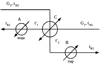 G1, G2 — расходы потоков первого и второго, кг/ч