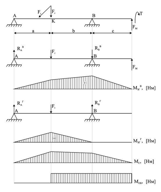 Знаходимо небезпечний переріз при розрахунку на втомленність. Він проходить через точку К, тому що тут маємо найбільшу кількість концентраторів напружень: шпонковий паз та посадка маточини колеса на вал