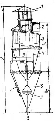 Циклоны с большей высотой цилиндрической части по отношению к конической получили название циклонов цилиндрического типа, и, наоборот, циклоны с большей высотой конической части - циклонов конического типа.