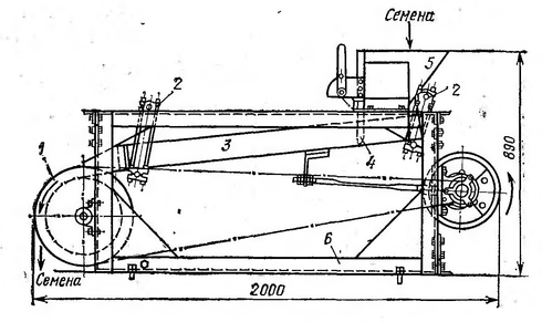 Семена через бункер 5 попадают на лотковый транспортер З, выполняющий функции глушителя скорости, и равномерным слоем определенной толщины подаются на поверхность электромагнитного барабана 1. Толщина слоя материала регулируется шибером 4, а распределение его по всей ширине лотка обеспечивается постоянным объемом материала в бункере.