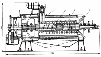 Станина пресса 1 состоит из двух чугунных стоек - передней и задней; они скреплены между собой четырьмя круглыми стяжками диаметром 45 мм. На передней стойке смонтированы редуктор и электродвигатель питателя 3. На задней стойке на специальном кронштейне укреплен концевой опорный подшипник шнекового вала. Между задней стойкой и концевым подшипником расположен регулятор давления 6 конусного типа. Редуктор 2 соединен со шнековым валом 5 при помощи дисковой муфты, выполняющей одновременно роль предохранительной защитной муфты: при перегрузке шнекового вала соединительные пальцы срезаются.