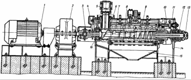 Маслосборное устройство 15 состоит из сливного листа и сборника масла и закреплено между передней и задней стойками станины на швеллерах. Привод маслопресса состоит из электродвигателя 1 и редуктора 2, которые соединены муфтой 3. Электродвигатель трехскоростной; изменяя число его полюсов, можно получить различную скорость вращения.