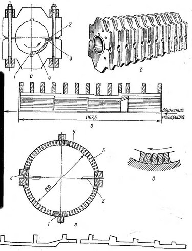 а - разрез зеера в сборе; б - общий вид; в - продольный разрез зеера; г - поперечный разрез по I ступени зеера; д - "заершенность" зеерного цилиндра; е - фигурные ножи.