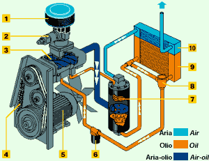 Образовавшаяся воздушно-масляная смесь сжимается в винтовом блоке 3 и поступает в маслоотделитель 7, где происходит сепарация масла и воздуха. Воздух после охлаждения в радиаторе 10 поступает на выход винтового компрессора а масло, после дополнительной фильтрации (фильтр 6), вновь возвращается в винтовой блок 3, при этом оно может проходить как через радиатор 9, так и, минуя его, в зависимости от температуры компрессора, регулировка осуществляется с помощью термостата 8.