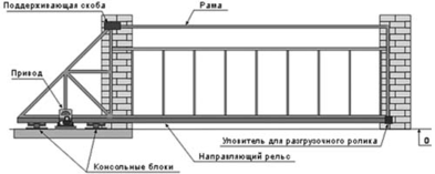 Сдвижные ворота представляют собой раму (полотно), которое перемещается вдоль линии забора по установленным на фундаменте тележкам (консольным блокам). Сам фундамент расположен на внутренней территории справа или слева от проезда и изготавливается до установки ворот.