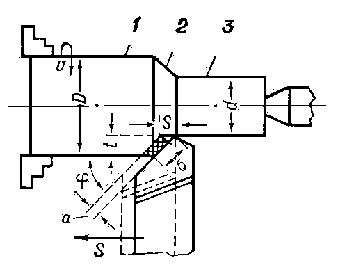 1 — обрабатываемая поверхность; 2 — поверхность резания; 3 — обработанная поверхность; D — диаметр обрабатываемой заготовки; d — диаметр детали после обработки; а и б — толщина и ширина срезаемого слоя