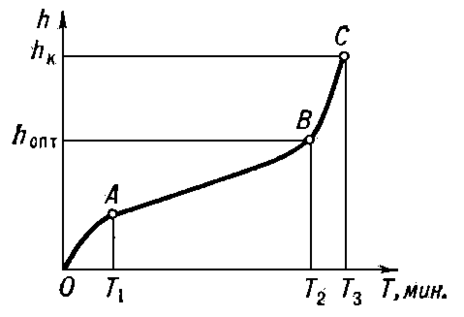 OA — период приработки; AB — период рабочего изнашивания; ВС — период катастрофического изнашивания