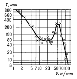 Скорость резания, допускаемая режущим инструментом, зависит от тех же факторов, что и силы резания, и находится в сложной зависимости от его стойкости (рис. 5).