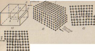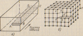 Наиболее простои и наглядный способ образования дислокаций в кристалле— сдвиг (рис. 1, а) Если верхнюю часть кристалла сдвинуть относительно нижней на одно межатомное расстояние, причем зафиксировать положение, при котором сдвиг охватывает не всю плоскость скольжения, а только часть ее АВСD, то граница АВ между участком, где скольжение уже произошло, и не нарушенным участком в плоскости скольжения и будет дислокацией (рис. 1, а).