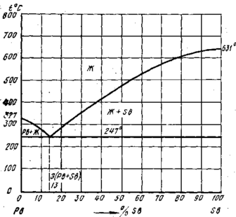 Линия АСВ является линией ликвидус (начало кристаллизации), линия DСЕ линией солидус (конец кристаллизяции). На линии АС начинают ( при охлаждении) выделяться кристаллы свинца, а на линии СВ — кристаллы олова. На линии DСЕ из жидкости концентрации 13% одновременно выделяются кристаллы свинца и олова.