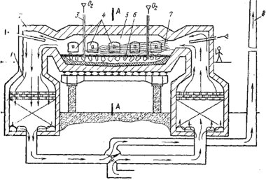 Для подогрева воздуха и газа (при работе на низкокалорийном газе) печь имеет два регенератора 1. Регенератор — это камера, в которой размещена насадка — огнеупорный кирпич, выложенный в клетку. Отходящие из печи газы имеют температуру 1500—1600 °С. Попадая в регенераторы, газы нагревают насадку до 1250—1280 °С. Через один из регенераторов, например, правый, подают воздух, который, проходя через насадку, нагревается до температуры 1100— 1200 °С и поступает в головку печи, где смешивается с топливом; на выходе из головки образуется факел 7, направленный на шихту 6. Отходящие газы проходят через противоположную головку (левую), очистные устройства (шлаковики), служащие для отделения от газа частиц шлака и пыли, направляются во второй (левый) регенератор, нагревая его насадку. Охлажденные газы покидают печь через дымовую трубу 8. После охлаждения насадки правого регенератора переключают клапаны и поток газов в печи изменяет направление: через нагретые левый регенератор и головку в печь поступает воздух, а правый нагревается теплотой отходящих газов. Факел имеет температуру 1750—1800 °С и нагревает рабочее пространство печи и шихту. Факел способствует окислению примесей шихты при плавке.
