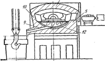 Она имеет рабочее плавильное пространство, ограниченное снизу подиной 12, сверху сводом 11, а с боков передней 5 и задней 10 стенками. Подина имеет форму ванны с откосами по направлению к стенкам печи. Футеровка печи может быть основной и кислой. Если в процессе плавки стали в шлаке преобладают основные окислы, процесс называют основным мартеновским процессом, а если кислые — кислым. Основную мартеновскую печь футеруют магнезитовым кирпичом, на который набивают магнезитовый порошок. Кислую мартеновскую печь футеруют динасовым кирпичом, а подину набивают из кварцевого песка. Свод мартеновской печи делают из динасового кирпича или магнезитохромитового кирпича. В передней стенке печи имеются загрузочные окна 4 для подачи шихты и флюса, а в задней — отверстие 9 для выпуска готовой стали.