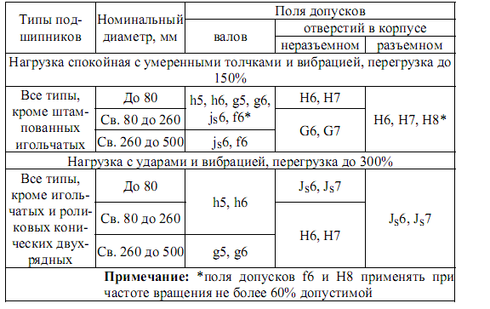 Таблица 7 – Рекомендуемые поля допусков валов и отверстий корпусов под подшипниками качения с местным нагружением колец